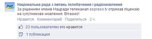 Украинский телеканал Еспресо TV получил лицензию на спутниковое вещание сроком на десять лет. Об этом представители Нацсовета по вопросам телевидения и радиовещания сообщили на своей странице в Facebook.