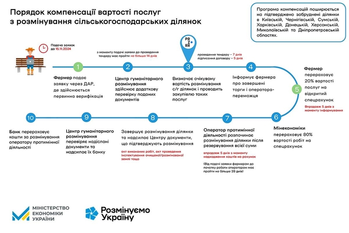 "Сегодняшнее решение правительства позволит фермерам уже весной заключать контракты как с государственными, так и частными операторами противоминной деятельности на очистку сельскохозяйственных земель и получить компенсацию из государственного бюджета. Это мощный шаг к запуску рынка гуманитарного разминирования", - прокомментировала министр экономики Юлия Свириденко.