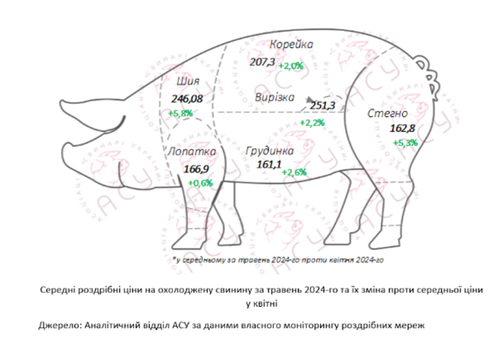 В мае 2024 года цены на свинину в национальных торговых сетях были выше, чем в апреле. Об этом сообщили в аналитическом отделе ассоциации "Свиноводы Украины" (АСУ).