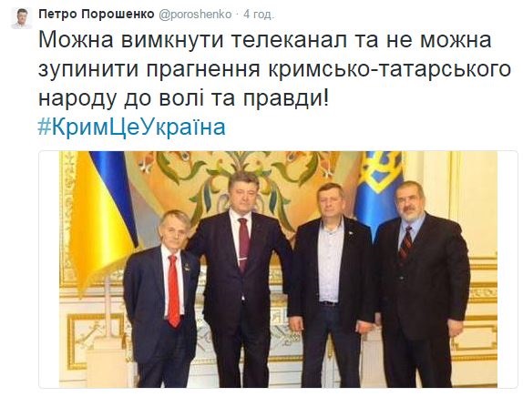 "Поручил Министерству информационной политики создать условия для работы канала ATR в Украине", - говорится в сообщении, обнародованном в Twitter Порошенко в среду, 1 апреля.