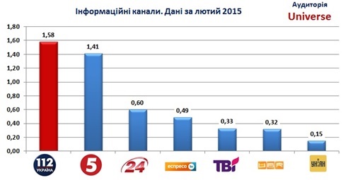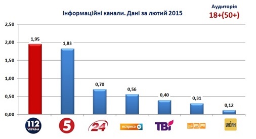 "112 Украина" в феврале стал первым среди информационных каналов страны. По сообщению пресс-службы канала, "112" показал лидерство по аудиториям 18+, 18+(50), Universe 4+ и аудитории Киева.