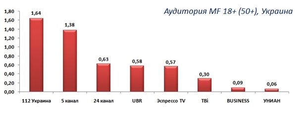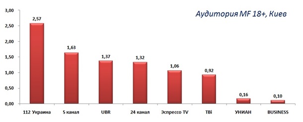 Отметим также, что вчера с высокими показателями прошло телесмотрение "112 Украина" и среди аудитории Киева. Канал надежно закрепился в лидерах столичной аудитории 18+ с долей 2,57% среди всех информационных вещателей.