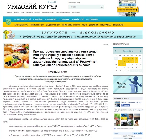 Украина ввела специальные пошлины на поставку белорусских молочных продуктов, кондитерских изделий и пива. Соответствующее решение приняла Межведомственная комиссия по международной торговле, сообщает правительственное издание Урядовый курьер в среду, 16 июля 2014 года. Решение комиссии вступает в силу через 10 дней с момента его опубликования.