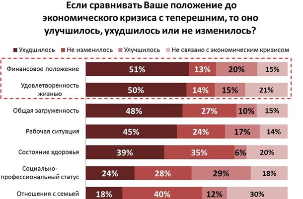 По оценкам половины работников, имеющих стаж более пяти лет, их финансовое положение значительно ухудшилось по сравнению с 2007 годом, причем ухудшение произошли в результате кризиса. "А вот положительных изменений в материальном положении существенно меньше: только один из пяти работников заявляет, что его дела пошли вверх", - свидетельствуют результаты опроса.