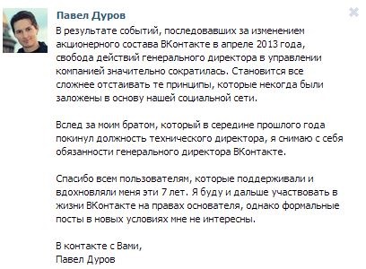 В сообщении он написал, что в результате событий, последовавших за изменением акционерного состава ВКонтакте в апреле 2013 года, свобода действий генерального директора в управлении компанией значительно сократилась.