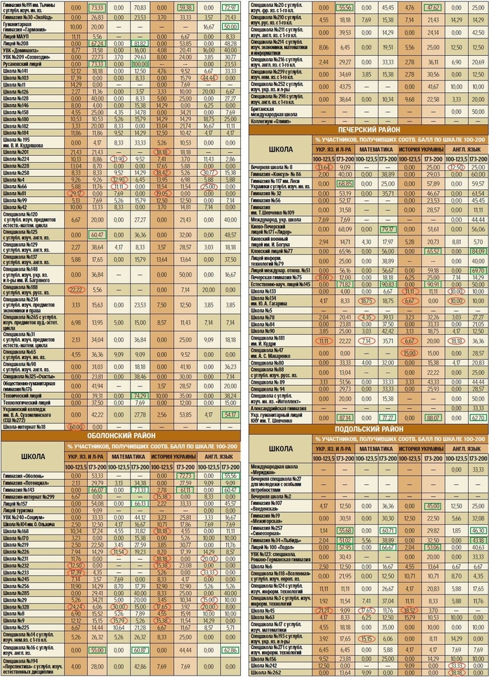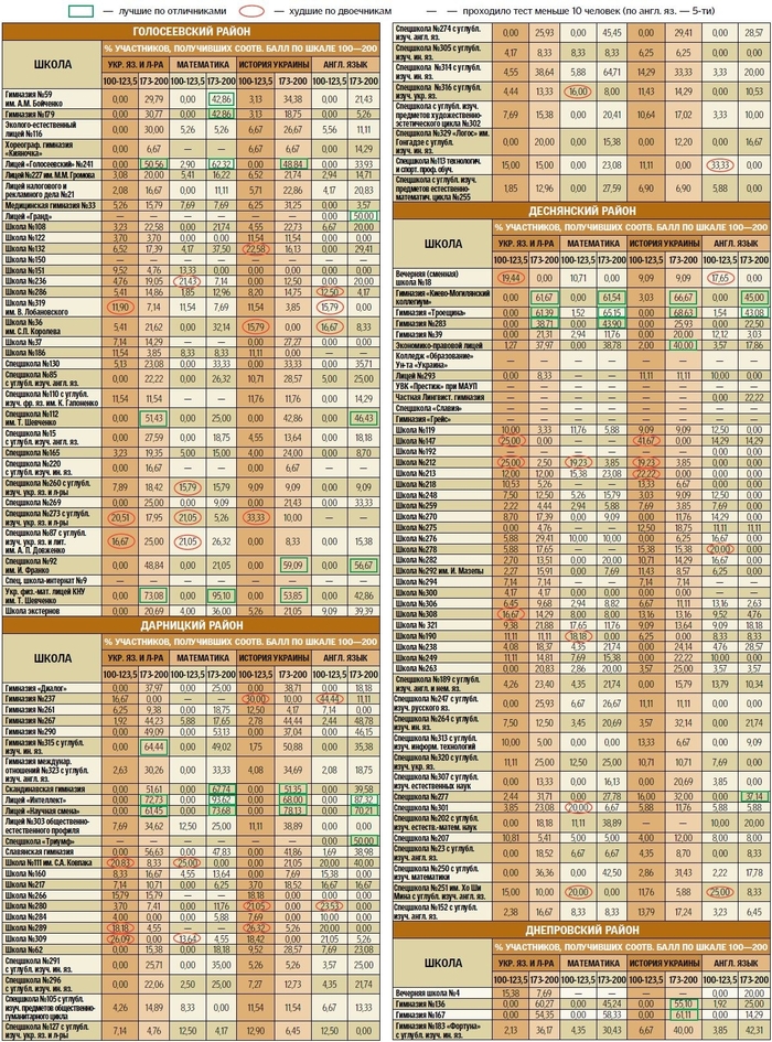 ДВОЕЧНИКИ. В отличие от лидеров, у аутсайдеров все по-прежнему. Как и в прошлом году, двоечников больше всего в Дарницком, Деснянском, Днепровском и Оболонском районах. Здесь количество тех, кто не набрал 124 балла, — в среднем 5—7%. Это почти в два раза больше, чем, к примеру, в Печерском, Подольском и Шевченковском районах, где этот показатель составляет всего 2—4%.