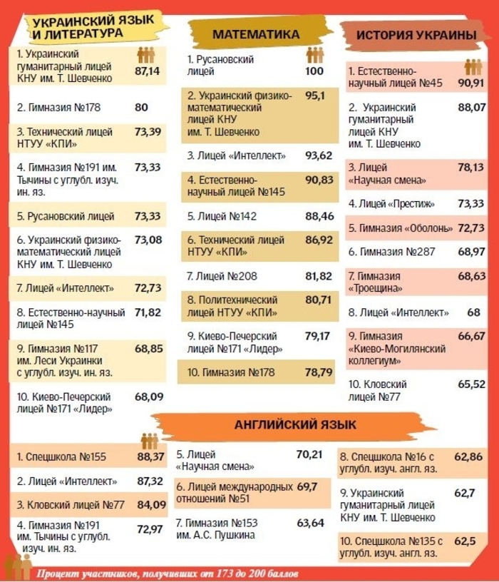 Мы взяли за основу 4 предмета, тесты по которым проходило больше всего участников: украинский язык (91,2% от общего числа зарегистрировавшихся), математика (57,2%), история Украины (58,4%) и английский (25,2%). От разных школ в тестах по одной и той же дисциплине участвовало разное число учеников — от 2—15 до 50—150. Поэтому для объективности по тому предмету, где на тесты пришло меньше 10 учеников, мы ставили прочерк (для английского — 5 человек). Иначе бы получилось, что, к примеру, Русановский лицей занял бы 2-е место в топ-10 лучших по истории Украины, обогнав лицей «Научная смена», так как в нем отличников, которые сдали тест на 173—200 б., — 83,3%, а в «Научной смене» — 78,13%. Но при этом от Русановского лицея пришло 6 человек, а от «Научной смены» — 32. Затем мы взяли результаты Украинского центра оценивания качества образования и сложили проценты тех, кто заработал от 173 до 200 б. Так, в спецшколе №16 с английским уклоном по этому предмету от 173 до 183 б. набрали 34,29% учеников, от 183,5 до 190 — 11,43%, от 190,5 до 195 — 8,57%, от 195,5 до 199,5 — 8,57%, а 200 баллов — 0%. Итого тех, кто набрал от 173 до 200 б. в этой школе, — 62,86%. По такому принципу мы определили тройки лучших школ в каждом районе. А в число аутсайдеров попадали те школы, в которых большой процент учеников, недотянувших до 124-х баллов.