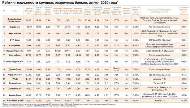 Для рейтинга использована отчетность банков на 01.07.2020, опубликованная НБУ в разделе «Статистика» («Згруповані балансові залишки»). В рейтинг вошли банки с активами свыше 15 млрд. грн. и депозитами физлиц – более 1 млрд. грн. Поскольку объем депозитов физлиц в Проминвестбанке сократился до 25,3 млн. грн., банк не вошел в рейтинг. К сожалению, мы были вынуждены не включить в рейтинг Сбербанк, вокруг которого слишком много политических трений, и присутствуют санкции в отношении его материнской компании. Если его продажу нероссийским покупателям разблокируют, он вернется в рейтинг.