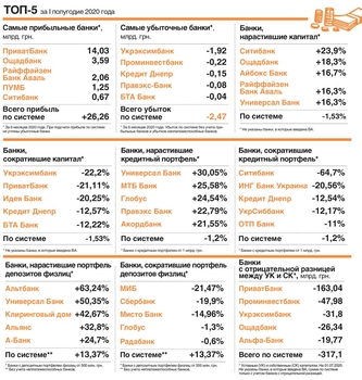 Прибыльными по итогам января–июля 2020 года были ПриватБанк (14,04 млрд. грн.), Ощадбанк (3,59 млрд. грн.), Райффайзен Банк Аваль (2,06 млрд. грн.), ПУМБ (1,25 млрд. грн.), Ситибанк (0,67 млрд. грн.), УкрСиббанк (0,66 млрд. грн.), Альфа-Банк (0,58 млрд. грн.), ОТП Банк (0,58 млрд. грн.), Укргазбанк (0,43 млрд. грн.), Креди Агриколь Банк (0,39 млрд. грн.).