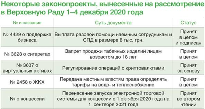 Парламент под конец года решил выделить по 8 тыс. грн. помощи наемным сотрудникам и предпринимателям, которые попали под действие карантинных ограничений, одобрил развитие в Украине внутреннего водного транспорта и не смог принять во втором чтении закон об «инвестнянях».