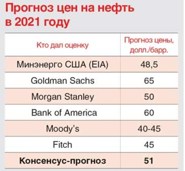 Аналитики, между тем, не особо верят в ценовые рекорды. «Нефтяные цены будут варьироваться на уровнях около 40–45 долл. за баррель в 2021 году. Наш среднесрочный ценовой диапазон для Brent – 45–65 долл./барр.», – говорится в докладе рейтингового агентства Moody’s, который был опубликован в начале декабря. Аналитики Morgan Stanley более оптимистичны, как и эксперты Bank of America – см. табл.