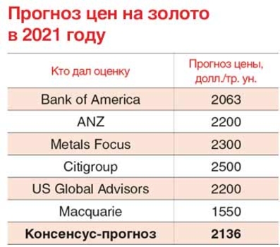 На 2021 год эксперты сохраняют довольно оптимистичные прогнозы в отношении золота (см. табл). К слову, крупнейшая в мире золотодобывающая компания Newmont намерена нарастить добычу золота в 2021 году на 8% – до 6,5 млн. тр. унцию в ожидании роста спроса на драгметалл.