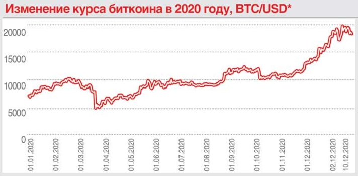 Инвесторы, которые вложились в начале 2020 года в биткоин, смогли сорвать неплохой куш. С января по декабрь цена этой криптовалюты выросла почти в 2,6 раза – с 7,2 тыс. долл. до 18,2 тыс. долл. Правда, отметку в 20 тыс. долл. биткоин достичь так и не смог. Максимум, который он показал 30 ноября, – 19,7 тыс. долл.
