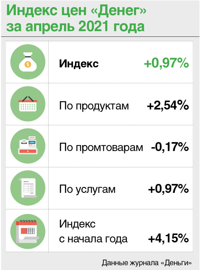 Рост цен чуть замедлился. Индекс «Денег» в апреле 2021 года вырос на 0,97% против роста в марте 2021 года на 1,87%. Всего с начала года прирост индекса «Денег» составил 4,15%. По данным Госслужбы статистики, потребительская инфляция в апреле 2021 года по сравнению с мартом 2021-го составила 0,7%, с начала года цены выросли на 4,8%.