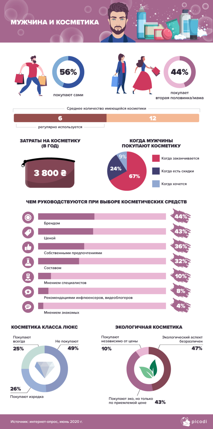 Украинцы в среднем тратят за год на косметику 3800 гривен, а в мужской косметичке находится всего 12 наименований. 56% мужчин покупают косметику самостоятельно, 44% поручают это дело женам или матерям. 67% мужчин идут за косметикой только тогда, когда она закончится. Косметику класса "люкс" могут позволить себе 25% мужчин, и только 10% респондентов интересуются эко-косметикой.