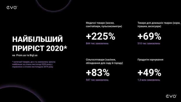 2020 год продемонстрировал рост доли продаж в онлайне до 9% от общего объема продаж товаров и услуг в Украине. Впрочем, это мало - в том же Китае показатель стабильно держится на 30%. При этом сумма среднего чека сократилась на 10%, это связывают с тем, что люди чаще стали заказывать в онлайне более дешевые товары. На фоне пандемии наибольший рост продаж в онлайне - 225% - продемонстрировала категория "медицинские товары", за ней идут "сельхозтовары" (83%), "товары для домашних животных" (69%) и "продукты питания" (43%).