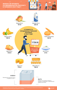По состоянию на январь 2021 года така корзина обойдется в 1 724 грн, что на 7,82% больше, чем год назад, и составит 35,7% от минимальной оплаты труда после уплаты налогов, что меньше, чем в прошлом году (42,1%). Таким образом, теоретически в Украине рост минимальной зарплаты опередил рост цен.