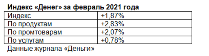 После передышки в феврале, цены снова рванули вверх. Индекс «Денег» в марте 2021 года вырос на1,87% против +0,50% в феврале и +0,81% в январе. А всего с начала года – на 3,2%. По данным Госслужбы статистики, потребительская инфляция в марте 2021 года по сравнению с февралем 2021 года составила 1,7%, с начала года цены выросли на 4,1%.