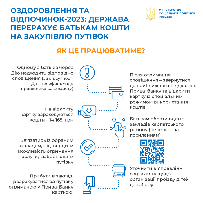 Родителям необходимо открыть карту в ПриватБанке со специальным режимом использования, на которую будет зачислено 14 165 грн на каждого ребенка. А после выбрать одно из учреждений оздоровления и отдыха высшей категории, содержащихся в Государственном реестре имущественных объектов оздоровления и отдыха детей. Все они находятся в карпатском регионе.