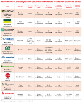Все банки предлагают РКО для малых предпринимателей. Причем, зачастую плату за открытие счета с СПД не берут. Но если она и есть, то символическая, в пределах 50–75 грн. Ежемесячная абонплата составляет 50–100 грн.