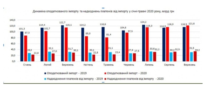 В Украину за сентябрь 2020 года импортировано налогооблагаемых товаров на 121,6 миллиарда гривень. В сравнении с сентябрем 2019 года импорт вырос на 4,4%.