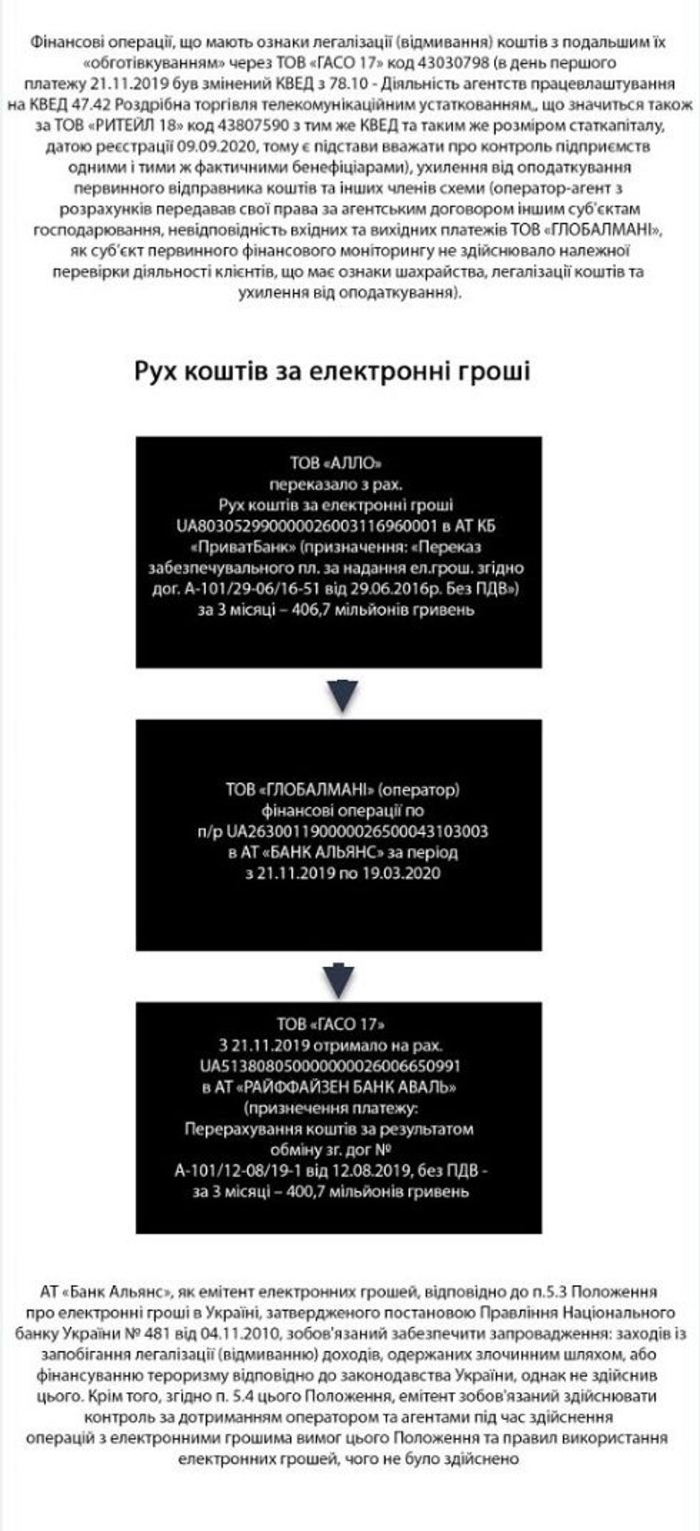 По информации правоохранителей предварительно установлено, что должностные лица ООО «ГлобалМани» (36425142) осуществляли финансовые операции с ООО «АЛЛО» (30012848) и ООО «ГАСО 17» (43030798) в период с ноября 2019 года по март 2020 года на общую сумму 807,4 млн грн, имеющих признаки мошенничества с финансовыми ресурсами и легализации доходов, полученных преступным путем в особо крупных размерах.