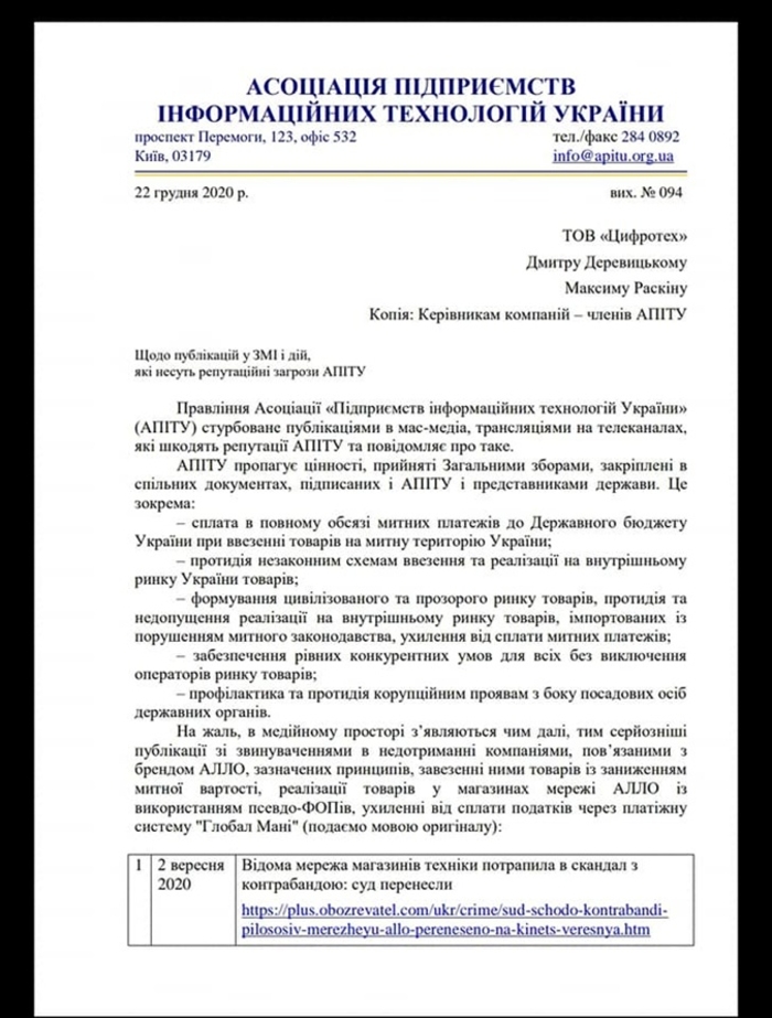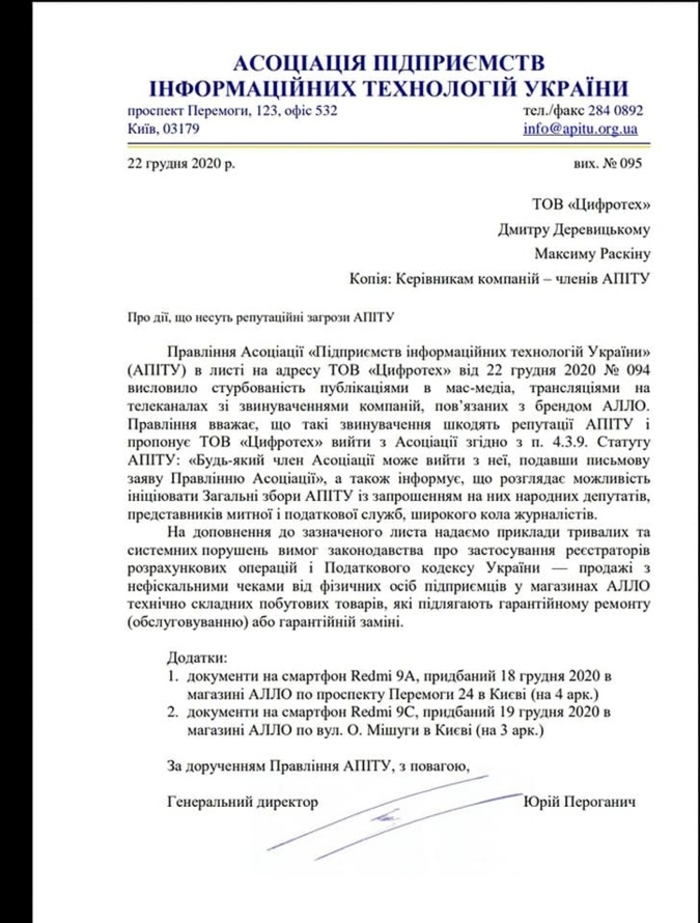 В письме на имя Дмитрия Деревицкого (основатель сети "АЛЛО"), SEO сети Максима Раскина и ООО "Цифротех" правление АПИТУ выражает озабоченность публикациями в СМИ относительно действий руководства сети "АЛЛО" и в дополнение к письму прикладывает примеры долгих и системных нарушений требований законодательства, в том числе факты продаж товаров в магазинах сети "АЛЛО" с нефискальными чеками от ФОП.