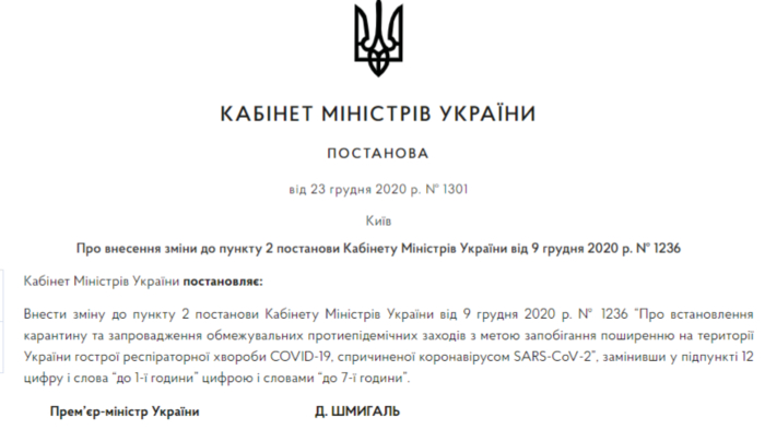 "Внести изменение в пункт 2 постановления Кабинета министров Украины от 9 декабря 2020 №1236 "Об установлении карантина и введении ограничительных противоэпидемических мероприятий с целью предотвращения распространения на территории Украины острой респираторной болезни Covid-19, вызванной коронавирусом SARS-CoV-2", заменив в подпункте 12 цифру и слова "до 1 часов" цифрой и словами "до 7 часов", - сказано в принятом министрами документе.