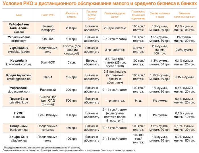 Ну а вообще, если выбирать РКО, исходя из потребностей своего бизнеса, можно рассчитывать на весьма схожие базовые параметры. За 100–150 грн. в месяц банки предлагают открытие текущего счета в гривне, также можно рассчитывать на выпуск платежной карты MasterCard или Visa класса Business. Плата за онлайн-платежи в пределах банка взиматься вне абонплаты не будет, а за пределы банка можно будет омуществить 3–5 платежей без дополнительной оплаты. Все остальные уже придется оплачивать отдельно.