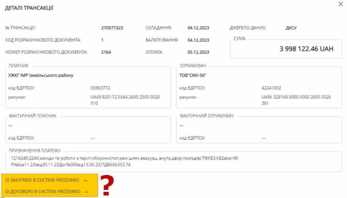 «Нет ни договоров у Прозорро, ни торжественных публикаций в местных СМИ. Только сухие платежки в Открытом бюджете, как эта, когда УЖКХ 5 декабря перечислило почти 4 млн грн подрядчику ООО «СМУ-56» за «меры и работы по территориальной обороне», а именно текущий ремонт путей эвакуации, внутридворовых проездов», – говорится в расследовании.