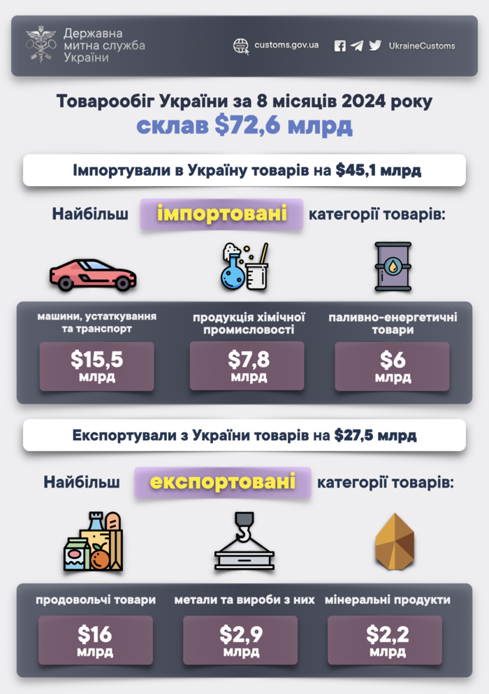 За 8 месяцев 2024 года товарооборот Украины составил $72,6 млрд. В январе-августе в Украину импортировали товаров на сумму свыше $45,1 млрд, а экспортировали - почти на $27,5 млрд. Об этом сообщили в Государственной таможенной службе.