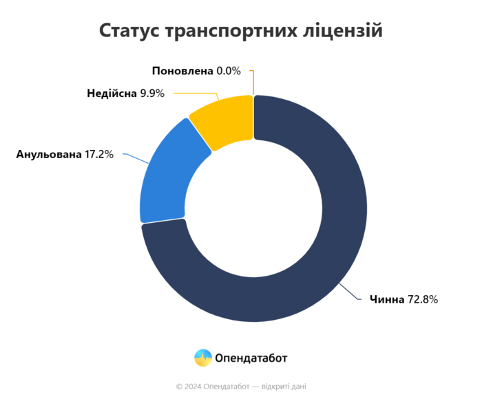 По состоянию на середину августа в Украине выдано более 78 тыс. транспортных лицензий. Только 72,8% из них действительны. Об этом пишет "Опендатабот", ссылаясь на данные Укртрансбезопасности.