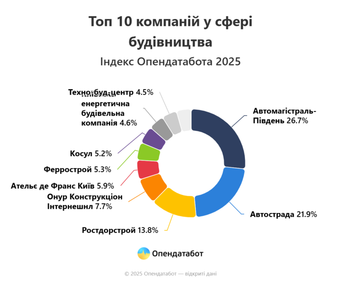 В 2025 году совокупный доход десяти крупнейших компаний строительной отрасли достиг 49,49 млрд грн, что на 41% больше по сравнению с 2023 годом. Общая прибыль лидеров выросла в 1,6 раза - до 3,09 млрд грн. Об этом свидетельствуют данные Индекса Опендатабота 2025.