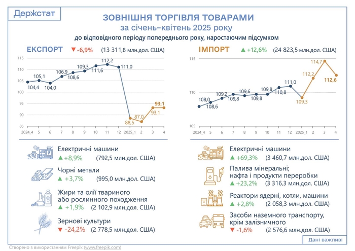 За январь-апрель 2025 года экспорт товаров из Украины составил 13 311,8 млн дол. США, или 93,1% по сравнению с январем-апрелем 2024 года, импорт - 24 823,5 млн дол., или 112,6%. Об этом свидетельствуют данные Госстата, пишут Dengi.ua.