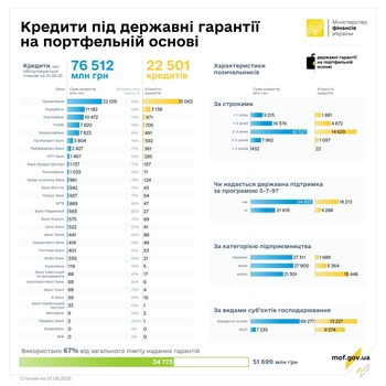 По состоянию на 1 июня 2025 29 банков-кредиторов обслуживают 22 501 кредит на 76,5 млрд грн. Обязательства по основному долгу, частично обеспеченные государственными гарантиями на портфельной основе, составляли около 34,8 млрд грн. Это 67% от общего лимита предоставленных гарантий (51,7 млрд грн).