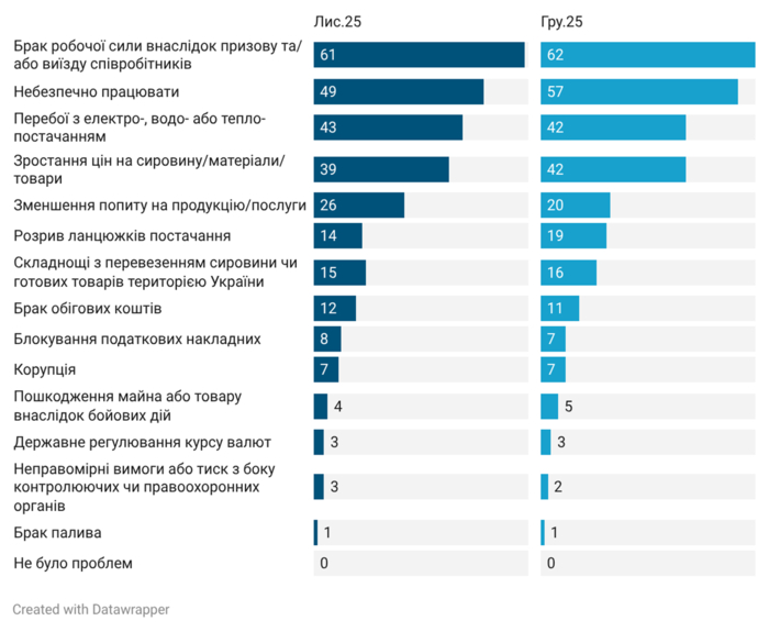 В декабре 2025 года тройка лидеров основных препятствий для ведения бизнеса не изменилась. Наибольшими вызовами остаются нехватка кадров и угроза безопасности. Об этом свидетельствуют результаты 44-го ежемесячного опроса, который Институт экономических исследований и политических консультаций провел с 18 по 31 декабря среди 485 промышленных предприятий, передают Dengi.ua.