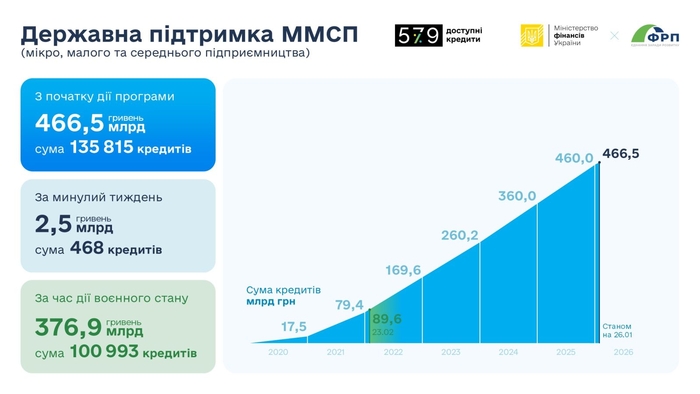 По данным Минфина, за время действия военного положения в Украине выдано 100 993 кредита на 376,9 млрд грн (в том числе банками государственного сектора 73 155 кредитов на 187,7 млрд грн), из которых по состоянию на 26 января текущего года: