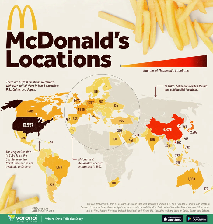 Сеть McDonald's, которая начала свою международную экспансию еще в 1960-х годах, на сегодняшний день охватывает почти 100 стран и территорий на всех населенных континентах мира. Наибольшая концентрация заведений со знаменитыми золотыми арками наблюдается в Азии, Европе и Северной Америке. Рейтинг стран по количеству ресторанов приводит visualcapitalist.com, сообщают Dengi.ua.