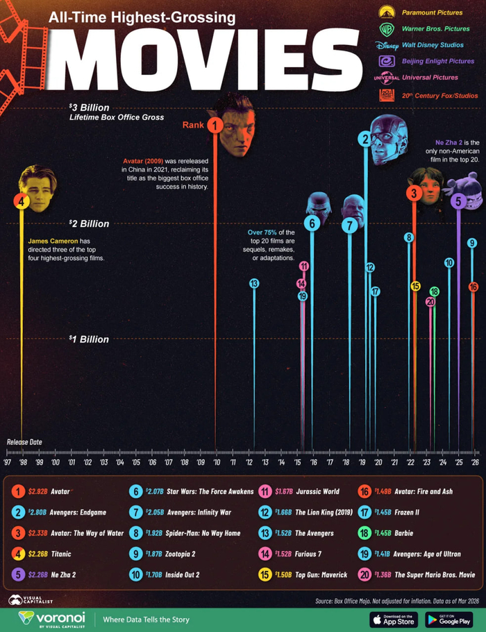 Все остальные позиции в двадцатке лучших занимают сиквелы, ремейки или экранизации. Среди них пять блокбастеров Marvel, адаптации игрушек и видеоигр («Барби» с $1,45 млрд и «Супер Марио» с $1,36 млрд), а также продолжения известных мультфильмов («Зверополис 2» с $1,87 млрд, «Головоломка 2» с $1,7 млрд и «Холодное сердце 2» с $1,45 млрд). Единственным неамериканским проектом в рейтинге является китайский сиквел «Нечжа 2».