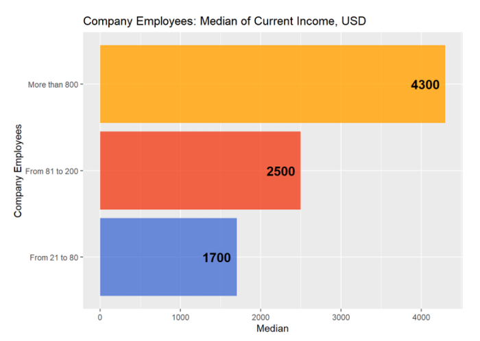 В материалах исследования говорится, что большая часть из 28 опрошенных респондентов, занимающих указанную должность, получает от 2000 до 4000 долларов заработной платы максимум. При этом в аутсорсе на той же должности платят от 3000 до 6360 долларов.
