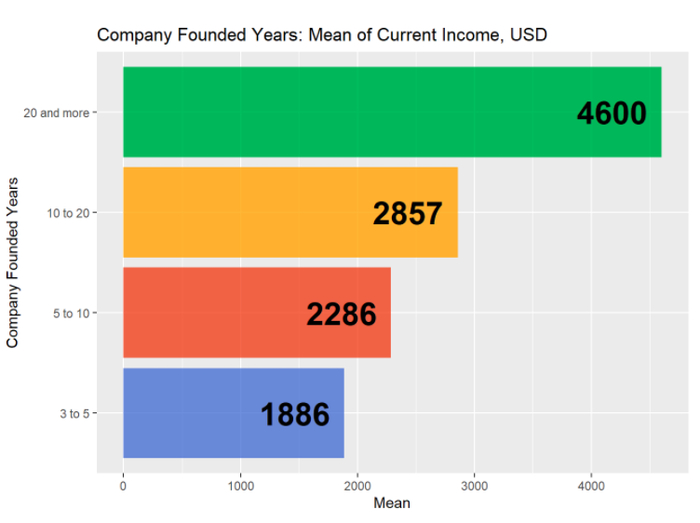 Также оказывает влияние количество сотрудников в компании и возраст компании. В компаниях, где 800 и более сотрудников, РМ в среднем может получить до 4300 долларов. Также, при работе в компании возрастом до 20 лет PM может зарабатывать около 4600 долларов, а вот в более молодом бизнесе (3-5 лет) - всего лишь в среднем 1886 долларов. Влияет также и возраст РМ - сотрудники старше 31 года в среднем могут заработать 3500 долларов против 2150 долларов у более младших коллег.
