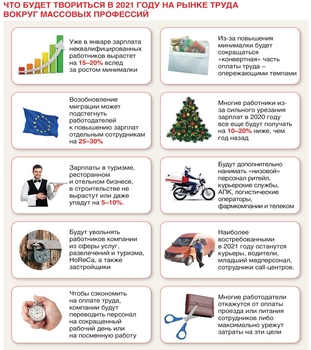 Многие компании не смогли противостоять пандемии и были вынуждены урезать зарплаты и увольнять сотрудников. В первую очередь бизнес сокращал тех, кого называют «синими воротничками». Это работники низкой квалификации, они, как правило, заняты простым физическим трудом. Впрочем, в 2021 году конкуренция за рабочие руки вновь возрастет. Все-таки есть надежда, что экономика начнет выбираться из ямы. Вот только возобновление трудовой миграции усилит давление на работодателей и конкуренцию за рабочие руки.