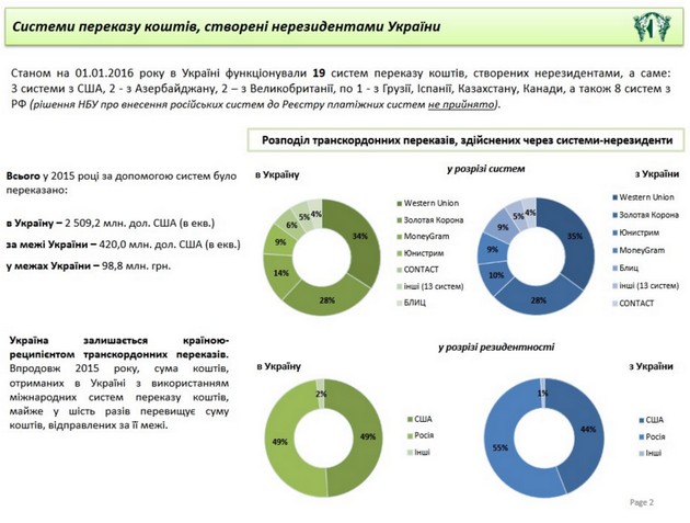 Украина остается страной-реципиентом трансграничных переводов, отмечают в НБУ. В течение 2015 года сумма средств, полученных в Украине с использованием международных систем перевода средств, созданных нерезидентами, в шесть раз превышает сумму средств, отправленных за ее пределы.