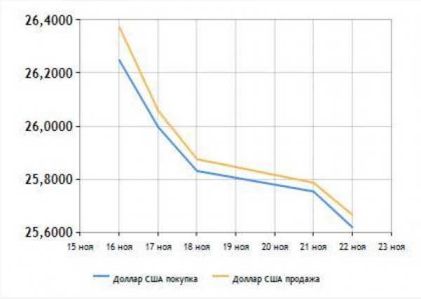 Гривня возвращает утраченные позиции. На рошлой неделе курс доллара подскочил как на межбанке, так и на черном рынке. Среди причин девальвации - укрепление американской валюты на мировых рынках и политическое напряжение внутри страны, всколыхнувшее наличный доллар. Уже в начале недели гривня вновь выросла в цене. На межбанке произошел откат котировок с максимальных 26,15 грн/$ - 26,3 грн/$ 16 ноября до 25,73 - 25,67 грн/$ по состоянию на вторник. Официальный курс НБУ на 23 ноября - 25,78 грн/$. Причины укрепления нацвалюты - реакция НБУ, приближающийся налоговый период и снижение протестных настроений.