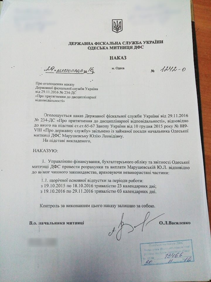 "Приказ о моем увольнении. Ему предшествовало 5 выговоров (которые премьер Гройсман безуспешно поручал отменить), объявление неполного служебного соответствия и мое заявление об увольнении, когда стало окончательно ясно, что в Киеве никто не собирается реформировать таможню", - написала Марушевская.