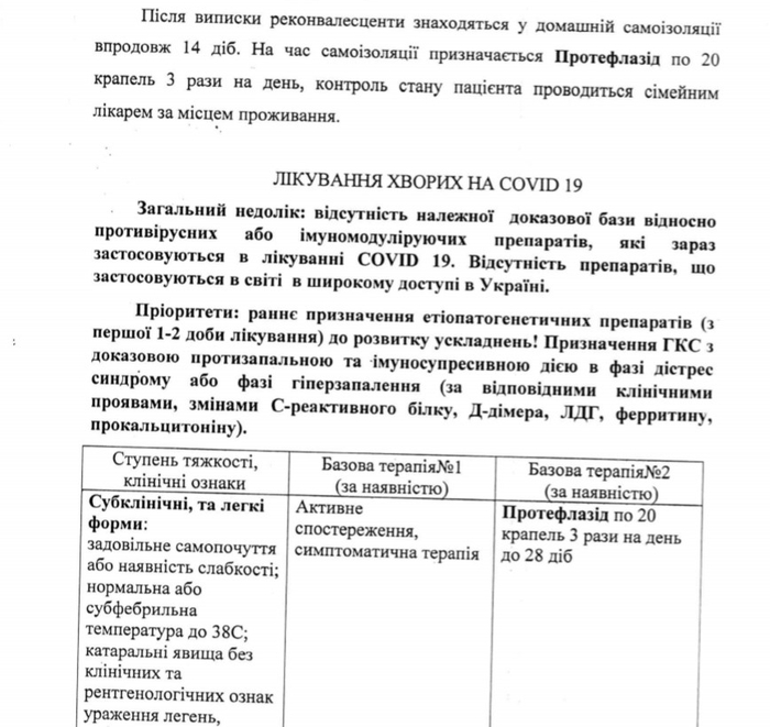 Заведующий отделом интенсивной терапии и детоксикации института эпидемиологии и инфекционных болезней им. Л. В.Громашевского, доктор медицинских наук Cергей Борщев объясняет выбор этого препарата так: "Применение препаратов, которые внесены в МОЗовский Протокол лечения Сovid-19, чревато серьезными побочными эффектами. О Протефлазиде я могу точно сказать, что за много лет клинического применения, побочных эффектов у него не наблюдал. А терапевтический эффект был – процент рецидивов вирусных заболеваний, как и частота ОРЗ значительно уменьшались. Главная задача в лечении инфекционных заболеваний – при помощи ранней этиотропной терапии предупредить репликацию инфекционного агента, что предполагает уменьшение случаев тяжелых форм заболевания и осложнений. Однако в МОЗовских протоколах нет препаратов для этой цели. Я ни в коем случае не хочу сказать, что Протефлазид – это панацея. Но я точно знаю, что препарат не навредит. Помогает ли при Сovid-19 – на этот вопрос можно ответить только после исследований. Чем мы сейчас и будем заниматься".