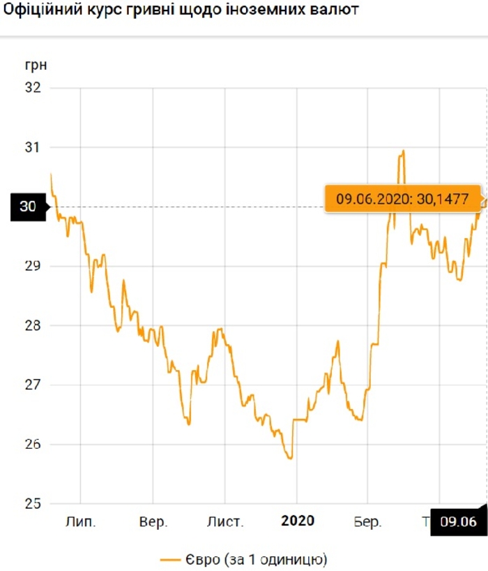 Стоимость евро в Украине перешагнула психологический рубеж. Сегодня, 9 июня, европейская валюта торгуется выше 30 грн