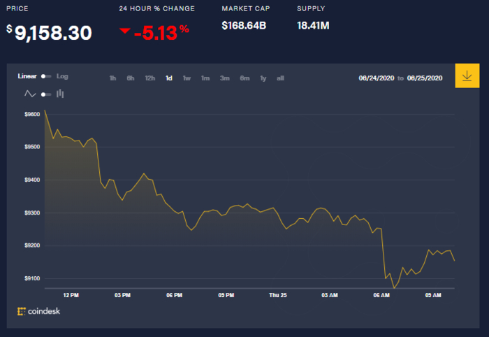 Так, на 10 утра 25 июня биткоин торгуется по 9158,30 доллара. В целом с начала суток биткоин упал до 9296 долларов за единицу а к утру - вообще до 9099 долларов. Средняя цена на биткоин установлена в размере 9158,30 долларов за единицу.