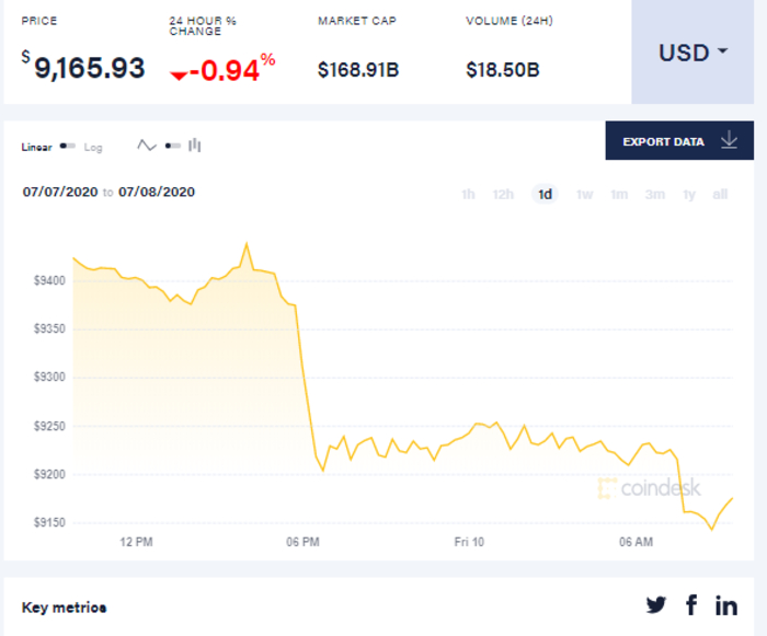 Так, на 9 утра 10 июля биткоин торгуется по 9,165.93 доллара. В целом с начала суток биткоин упал до 9242 долларов за единицу а к утру - упал еще сильнее, до 9203 долларов. Средняя цена на биткоин установлена в размере 9,165.93 долларов за единицу.