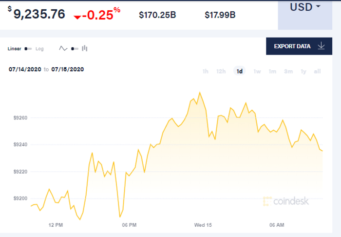 Так, на 9 утра 15 июля биткоин торгуется по 9,235.76 доллара. В целом с начала суток биткоин поднялся до 9272 долларов за единицу а к утру - упал до 9244 долларов. Средняя цена на биткоин установлена в размере 9,235.76 долларов за единицу.